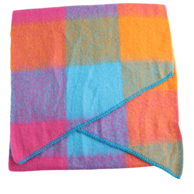 A new addition to the Winter range of cosy scarves. Be bright and bold with multi coloured tartan. This scarf drapes beautifully, with angled hem.